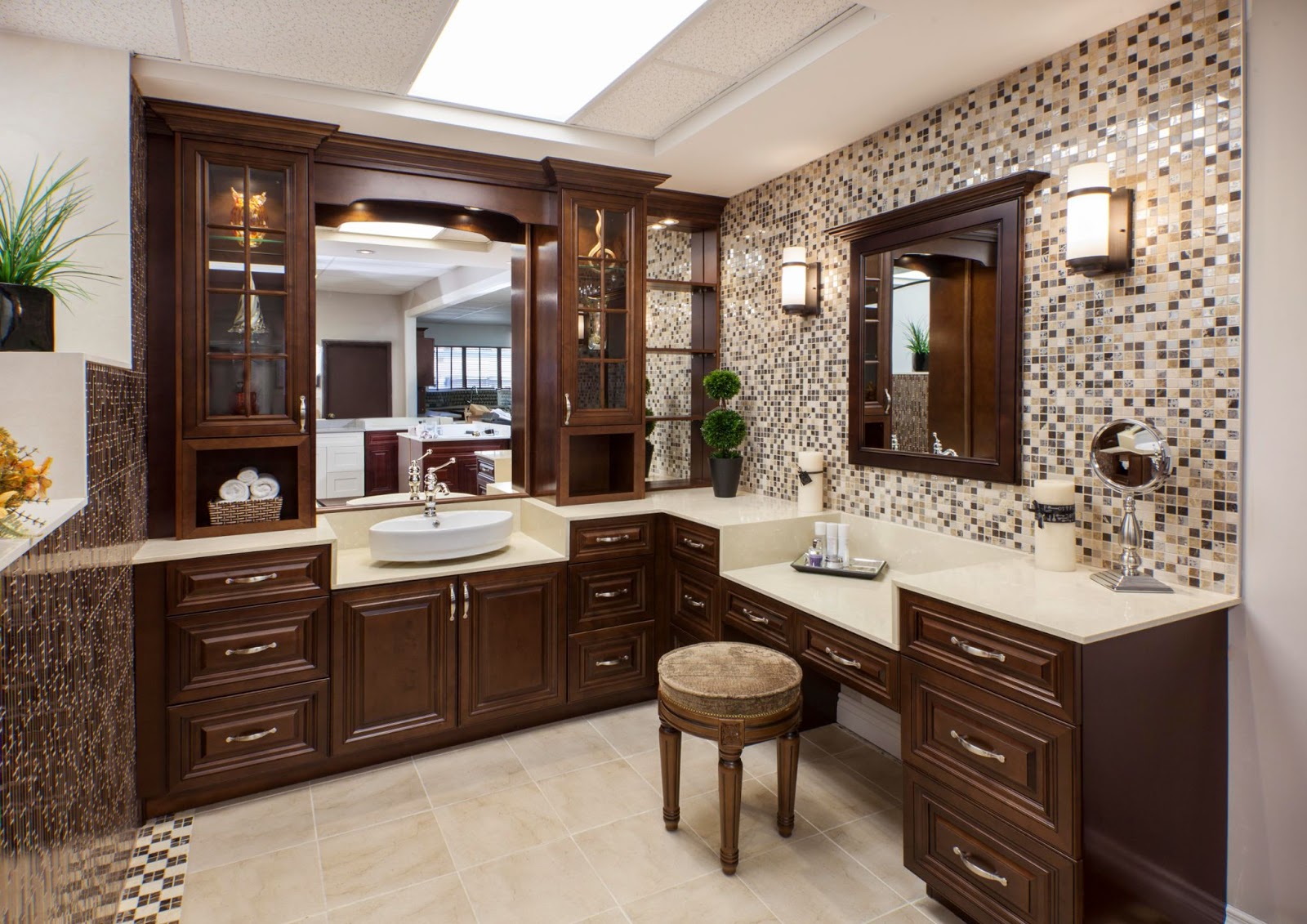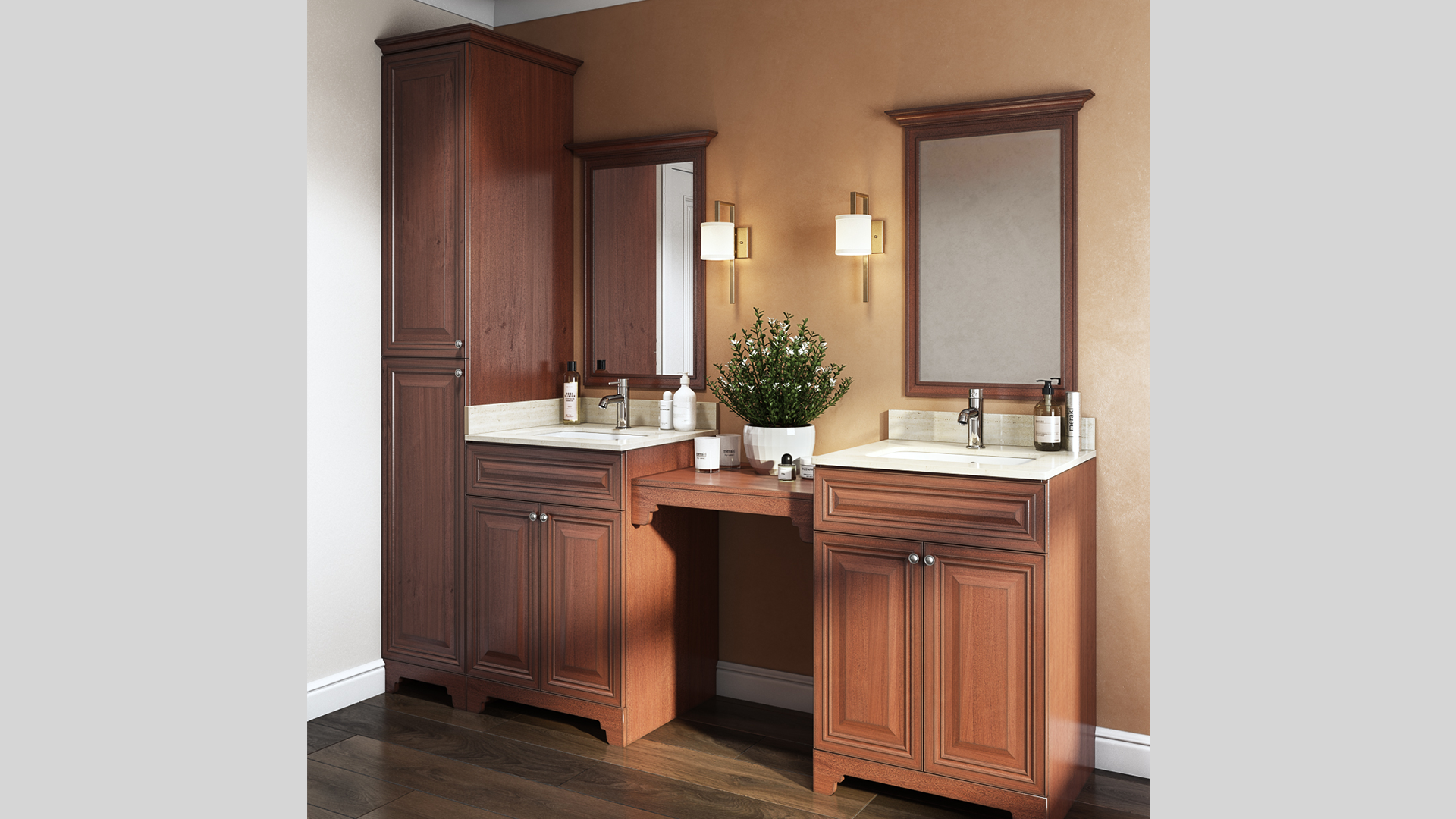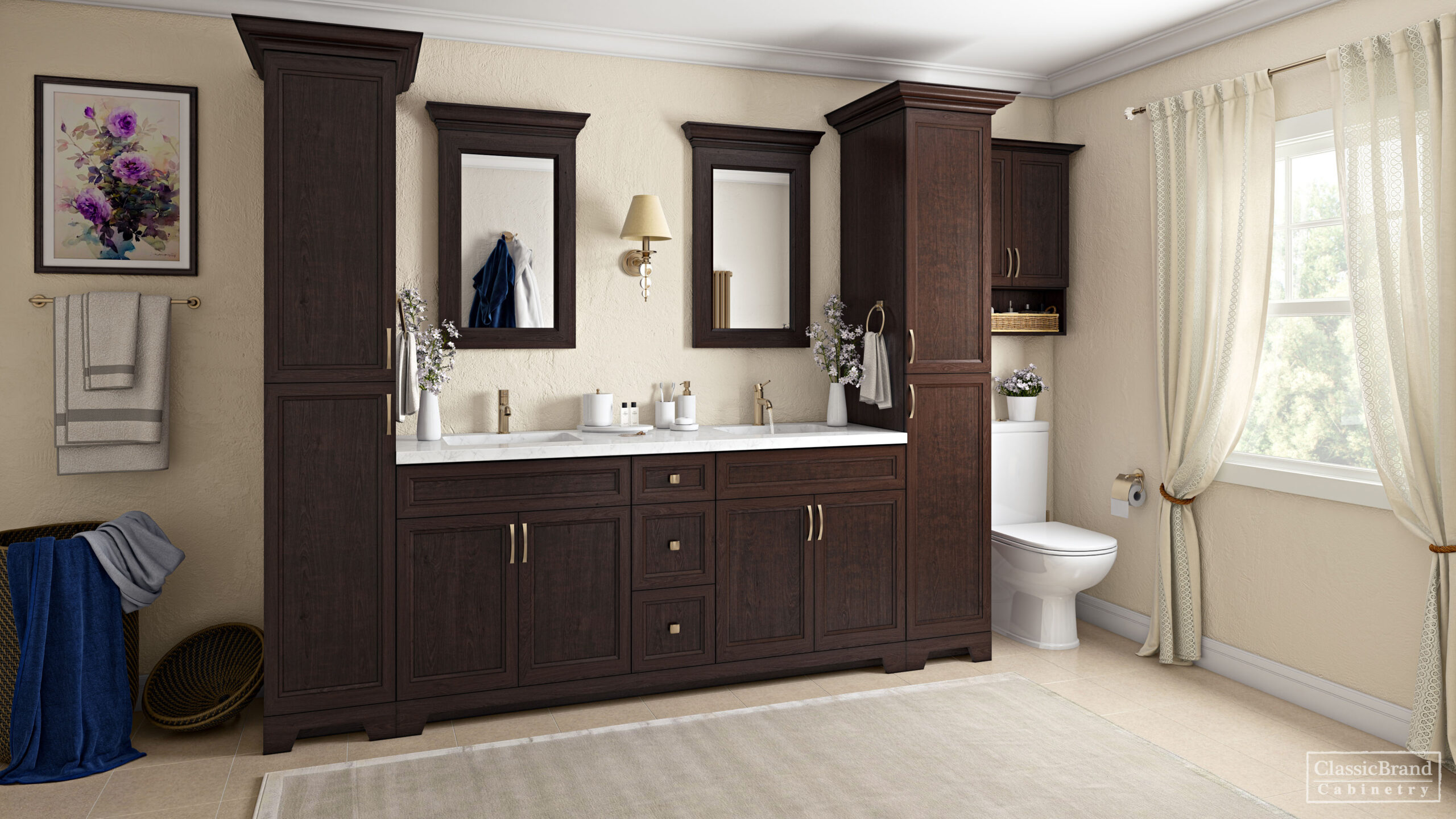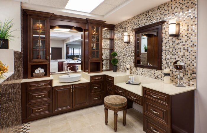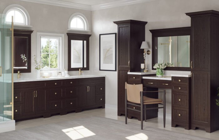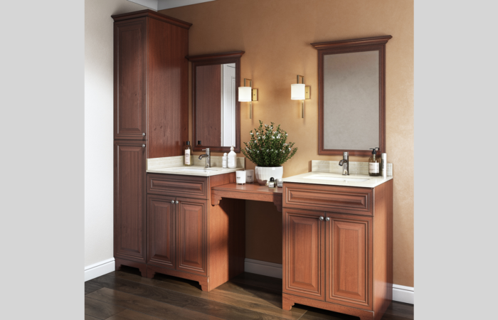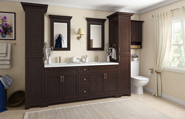 Traditional raised panel door style in stained walnut glazed finish. This line characterizes the old-fashioned sophistication. This is another timeless design best suited for a grand kitchen.